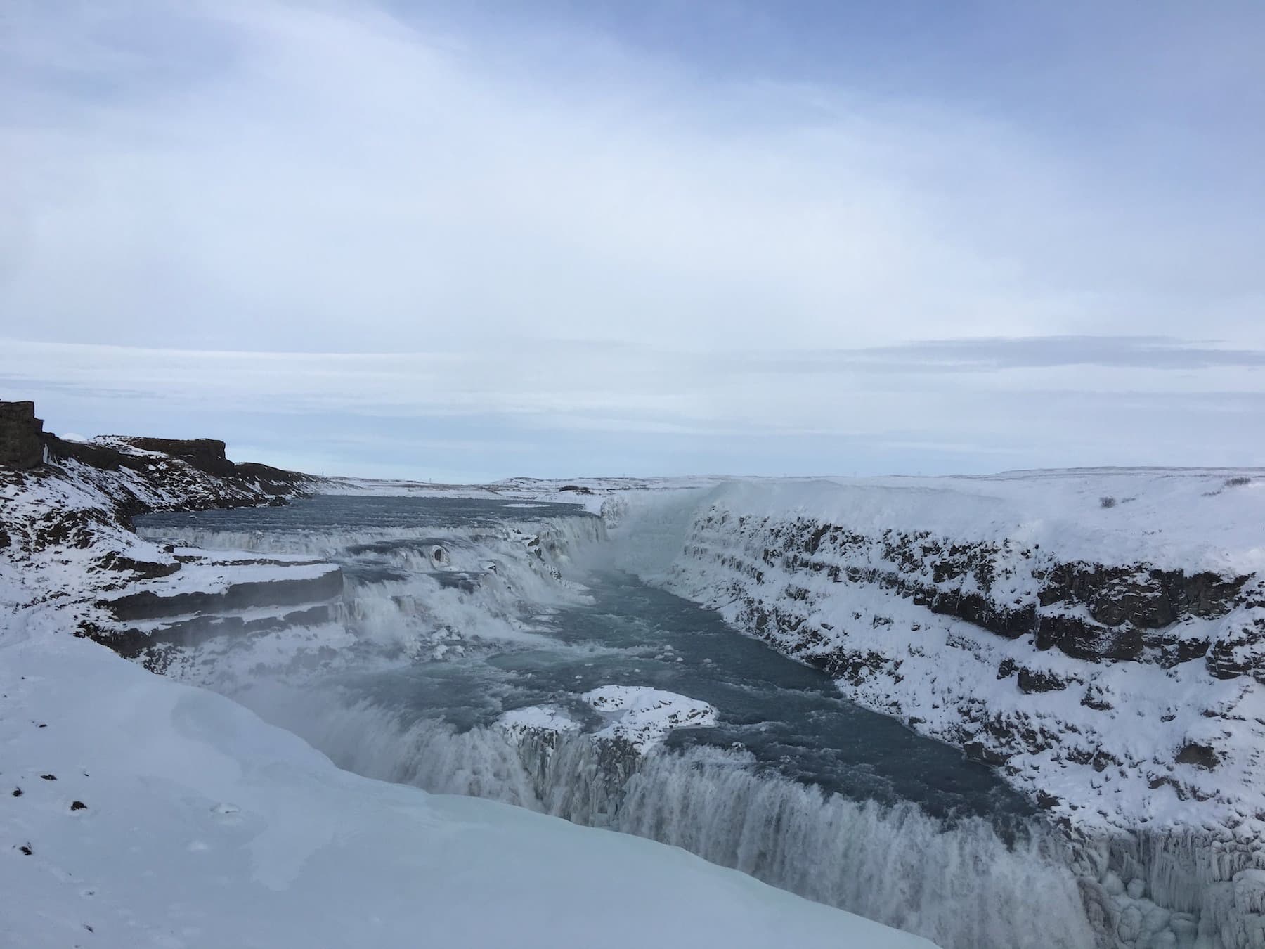 Next we headed for Gullfoss or the golden waterfall. Our Satnav took us down what seemed like a farm track covered in compressed and compacted snow. It was a bit hairy but we made it. As we walked from the car we could hear the buzz of falling water but in the cold twilight it was surreal when we saw it. A wall of water streaming in all directions that continued down, bifurcating and twisting into new rivulets on the way down. At points it was if it were a vertical river pouring into the centre of the world. Lower down it twisted into a hydra of further torrents exiting one's view through rocks and snow.